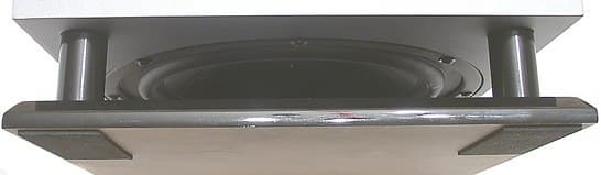 Акустическим оформлением сабвуфера является схема с фазоинвертором. Отверстие ФИ выведено на переднюю панель. Диффузор динамика выведен на нижнюю панель. Диаметр диффузора выполненного из бумаги составляет 22 сантиметра. Гибкий подвес изготовлен из резины.