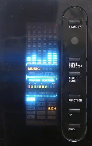На передней панели, как вы уже успели заметить, расположена небольшая панель управления с экраном. Экран выполнен довольно оригинально. В верхней части имеется даже подобие индикатора спектра, реагирующего исключительно на низкие частоты. Нижеиндикация различных включенных режимов и шкала уровня.