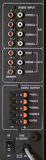 На задней стороне сабвуфера расположен радиатор больших размеров и элементы коммутации. Помимо шестиканального входа, набор имеет четыре дополнительных стерео входа. Любопытно, что при подключении через любой стерео вход, сигнал автоматически раскладывается на все шесть колонок и при этом кнопки отключения эффектпроцессора нет. Если вы предпочитаете прослушивать стерео исключительно в двух колонках, то вам придется отключать провода ненужных каналов (максимальное уменьшение громкости не помогает) или использовать фронтальный разъем из шестиканального входа, но в этом случае не будет играть сабвуфер.