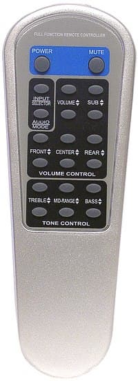 В наборе поставляется беспроводной пульт ДУ . Его габариты55 × 23 × 153 миллиметров. Питание от двух батарей типа ААА (как ни странно, но мы батареек в комплекте акустики не нашли). На пульте дублируются все кнопки панели управления и добавлена кнопка MUTE. Тем не менее, с пульта управлять удобнее, потому как, в отличие от панели, все регулируемые параметры на пульте выведены отдельными кнопками. Так же стоит обратить внимание на присутствие трехполосного эквалайзера и его реальное применение. Уровень высоких, средних и низких частот действительно изменяется без ощутимых потерь в качестве звучания.