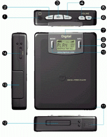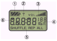 - Дисплей: сегментированный ЖК (LCD); отображается время проигрывания, число песен, битрейт, режим и т.д.