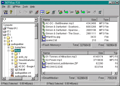 Ну что же, запишем mp3 файлы и послушаем, как звучит MPMan. Операцию записи файлов в память MPMan можно произвести с помощью простой и интуитивной функции drug'n'drop, т.е. просто выделяем нужные файлы и перетаскиваем их мышкой в нужную область памяти MPMan.