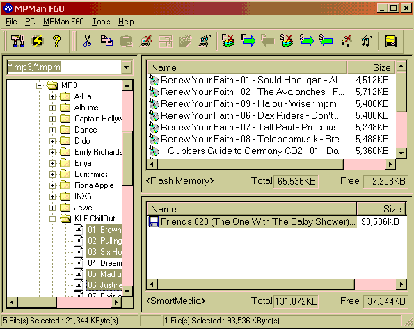 Для того чтобы карточка стала понятна плееру, ее необходимо "инициализировать". После инициализации совместимость с SSFDC пропадает. Ни цифровая камера, ни FlashPath-reader прочесть "инициализированную" карточку не смогли. Видимо, такие сложности были предприняты для того, чтобы записанные MP3-файлы нельзя было прочесть на другом совместимом устройстве и загрузить обратно в компьютер. Вот уж извращение. Ведь MP3-файлы все равно можно переносить с помощью плеера, который не анализирует внутреннюю структуру и заголовок файла, а смотрит только на расширение. Переименовал файл и вперед! Однако проигрывать плеер умеет только файлы с расширением MP3 (точнее, MPM, которое он дает этим файлам при их загрузке в плеер). Хочешь переносить файлы переноси, но слушать их нельзя. Замуровали, демоны... В общем, желание обмениваться музыкой с другими владельцами понимающих SmartMedia плееров осталось невыполненным.