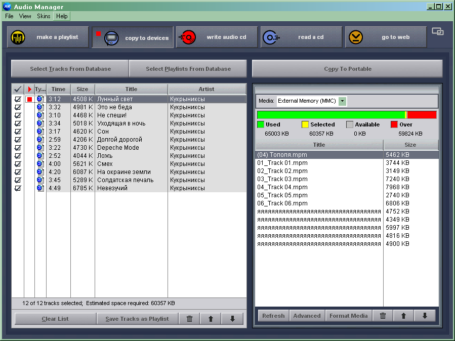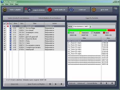 Впрочем, есть одна вещь, за которую программу можно похвалить. Логика работы именно такая, как мне нравится: выбираем файлы из коллекции, составляем нечто вроде плейлиста, одним нажатием кнопки записываем его в плеер. При этом, если выбрать слишком много файлов, то, во-первых, нам будет указано, сколько именно информации не влезет, во-вторых, предупредят о том, что она не влезет, а при попытке записи те файлы, что не получилось вместить в память, так и останутся выделенными. Можно сразу переключаться на карту памяти и одним нажатием кнопки отправить непоместившиеся файлы туда. Однако приведенных выше неудобств это все никак не компенсирует, хоть и достаточно удобно само по себе.
