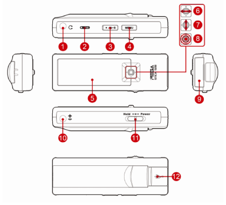 Управление MS528 кардинально отличается от всего того, что было в предыдущих моделях, так что про него есть смысл рассказать немного подробнее. Во-первых, появился джойстик (6-7-8) (или как его любят называть в руководстве — пятипозиционная кнопка), по конструкции очень похожий на тот, что присутствует в старшей линейке плееров MSI — Mega Player. Есть только одно отличие: нажатие на джойстик не вызывает меню (это делается отдельной кнопкой (4)), а выполняет функцию Play/Pause. С учетом трудностей с нажатием (оно нередко интерпретируется как отклонение в какую-либо сторону), это может испортить немало крови, приводя, например, к переключению треков вместо ожидаемой паузы. Навигация по папкам, кстати, тоже так и не появилась. Кнопка A-B (3), микрофон (2) и наушники (1) ничего особенного собой не представляют, а вот к переключателю (11) стоит присмотреться внимательнее: идея совмещения блокировки управления Hold c включением/отключением питания достаточно оригинальна и ранее редко встречалась. С одной стороны такое совмещение может показаться нелогичным, но с другой — позволяет избежать долгих и безуспешных попыток включить устройство с заблокированными кнопками. Опять очень огорчила регулировка громкости, которая осуществляется «фирменным» для MSI рядом дискретных значений с достаточно большим шагом (весь диапазон доступных громкостей разбит всего на 15 уровней), да и наивысший уровень громкости показался мне низковатым для прослушивания в метро.
