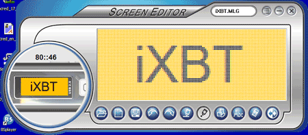Программа представляет собой наипростейший графический редактор адаптированный для создания изображений, логотипов и надписей более-менее прилично смотрящихся на скромном ЖК-экране плеера. Предпросмотр того, как созданное будет выглядеть, тоже доступно в кружочке внизу и слева окна программы. Создать логотип с надписью «iXBT», сохранить его на плеере и увидеть на экране (правда, для этого пришлось еще раз включить плеер и выбрать в настройках сохраненный логотип) никакого труда не составило :)