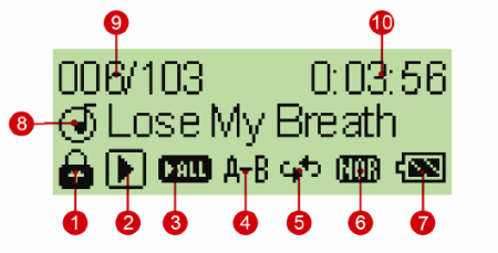 Разметка дисплея, в общем, привычна для плееров от MSI, так что еще раз перечислять все основные элементы мне не хочется, но раз уж на картинке они пронумерованы, то придется ;)