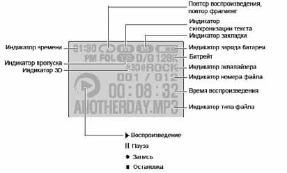 Информации на дисплей выводится достаточно много, да и читать ее удобно. Есть практически все, что только может понадобиться, даже «индикатор времени» (по-русски, просто часы :) В качестве недостатка можно выделить разве только тот факт, что плеер не умеет одновременно отображать индикаторы уровня сигнала (LEV Disp в меню) и название файла. Либо то, либо другое. Экран, конечно, не резиновый, но разместить индикаторы можно было и покомпактнее.