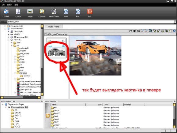 Основной программой на прилагаемом CD является MusicFriend, способный заливать музыку в плеер (намного удобнее, чем штатными средствами Windows), а также редактировать картинки и сохранять их в формате pfl, понимаемом плеером. Изображение необходимо подогнать под размер дисплея, для чего его придется масштабировать или обрезать. Кроме того, картинку можно вращать, и менять контрастность, но она от этого не станет лучше выглядеть на экране. Есть и удобная кнопочка LCD Zoom Out, автоматически масштабирующая изображение нужным образом.