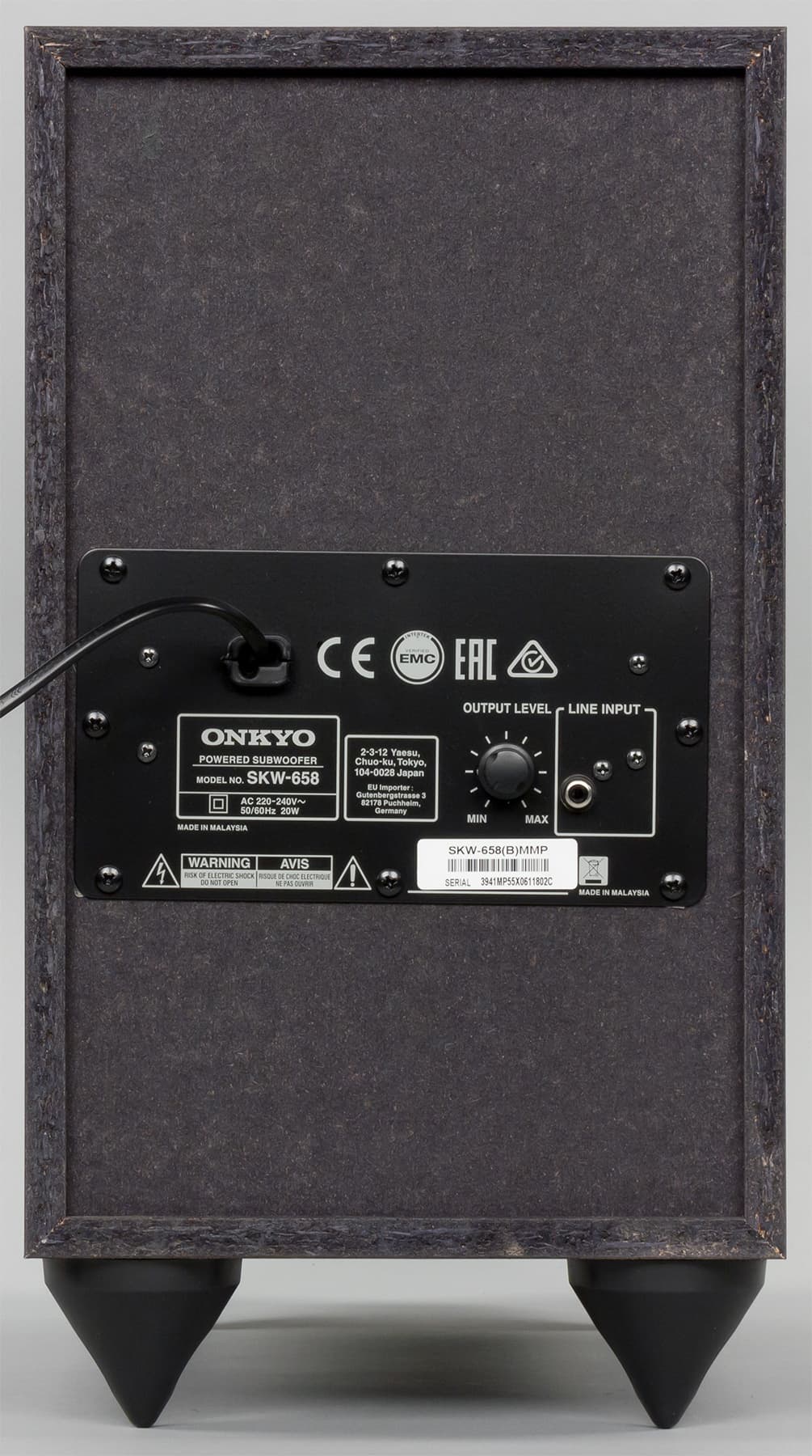 Что поразило при первом же включении — это бас. Он полновесный, с нужным уровнем и глубиной, и никак не ассоциируется с «кинотеатром в коробке». Сабвуфер играет динамиком в пол и из настроек имеет только регулятор уровня, который был установлен приблизительно на 70%, а в дальнейшем эксперименты с громкостью басовой дорожки производились только через настройку уровня с помощью пульта ресивера. Кстати, эти регулировки организованы удобно и не требуют многочисленных переключений между различными меню. Сабвуфер справляется с помещением под 30 м² и почти 3-метровыми потолками. Ход динамика большой, но сабвуфер не «захлебывается», искажения слышны только на очень высоких уровнях громкости. Призвуков крупного порта фазоинвертора, находящегося на передней панели сабвуфера, не слышно.