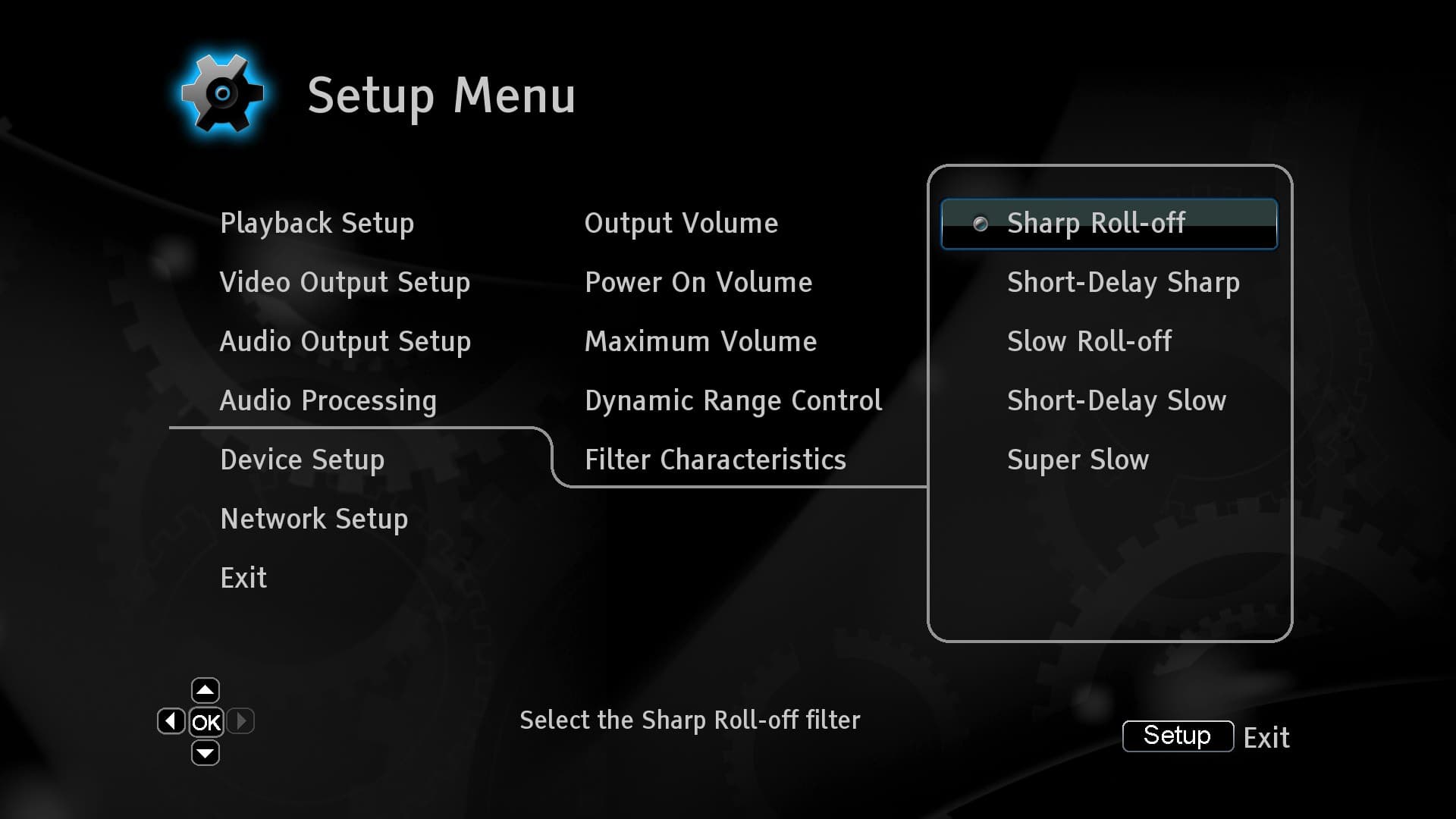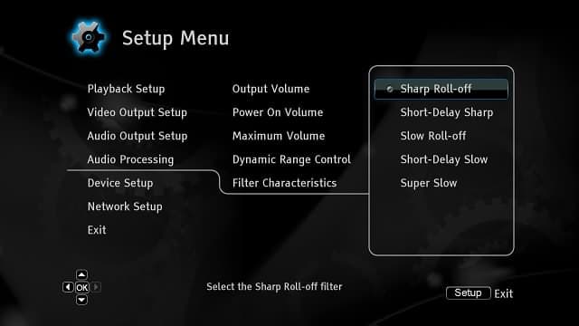 По умолчанию выставлена первая настройка, Sharp Roll-off, что в переводе означает «резкий спад». Этот тип фильтра является типичным для большинства звуковых устройств. Главное преимущество — в резком спаде и ровной частотной характеристике: неравномерность составляет ±0,004 дБ, что на два порядка ниже чувствительности слуха среднестатистического слушателя. Основной минус такого фильтра — так называемый «цифровой звон»: предзвучания и послезвучия на импульсной характеристике. Их амплитуда мала, но все же они вносят нежелательные изменения в атаку звука. Поэтому второй фильтр — Short-Delay Sharp, фильтр с короткой задержкой, где переходные процессы в несколько раз быстрее. Лично нам фильтры Sharp не очень понравились излишней агрессией в звуке. Возможно, они больше подойдут звуковому тракту с недостаточно проработанной атакой звука.