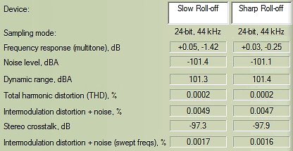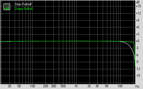 Slow Roll-off (в переводе — «медленный спад») предлагает улучшение переходных характеристик, взамен немного пожертвовав самыми высокими частотами слышимого диапазона. Завал АЧХ начинается с 8 кГц, где он составляет всего сотые доли дБ. Существенный спад возникает только с 15 кГц, где он составляет уже 1,4 дБ. Наши измерения хорошо показывают отличия двух этих фильтров в слышимом диапазоне: