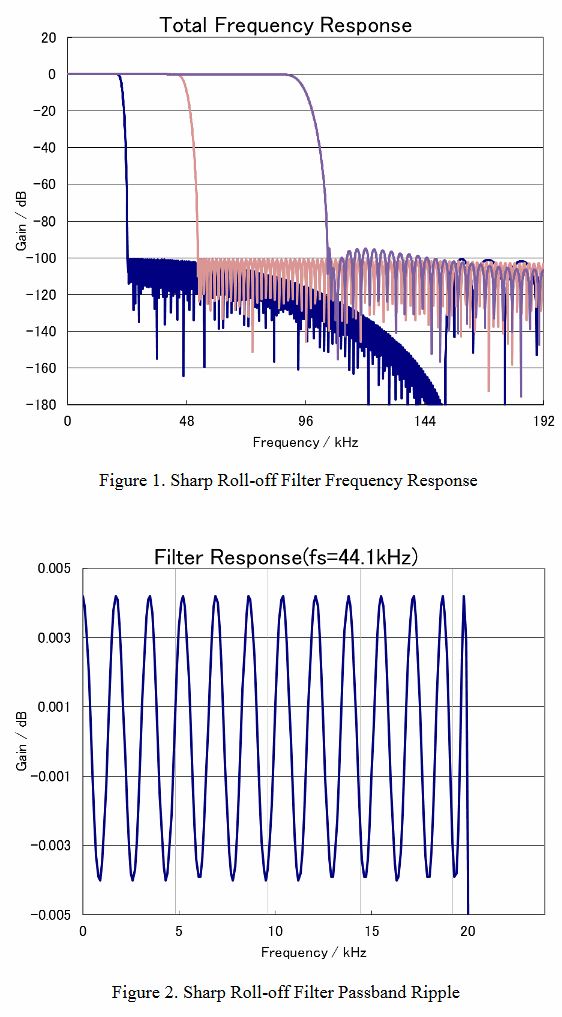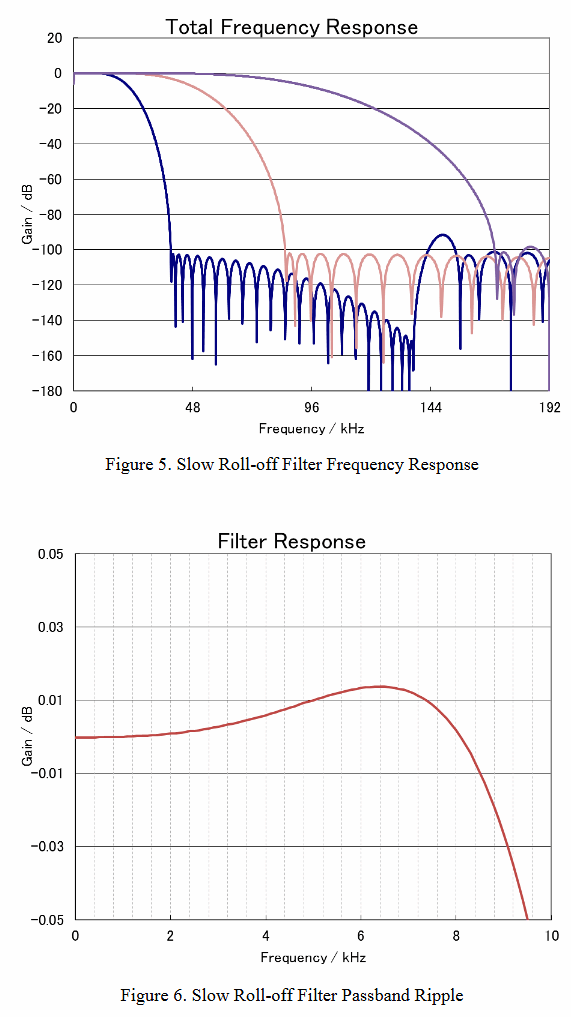 При этом на слух никаких проблем на ВЧ зафиксировать не удается, но есть отличия в характере звука. Это объясняется различием фазовых и импульсных характеристик. Так как медленный фильтр в теории более приятен на слух, есть три модификации со словом Slow. В практическом плане они отличаются не очень существенно. Основное назначение данных фильтров — поднять интерес энтузиастов, которым интересно лично повлиять на процесс формирования звука в ЦАП.