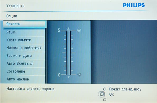 Настройки же самой рамки стандартны: яркость, время, дата, информация о картах памяти, вставленных в данный момент в слоты, включение/отключение автоповорота изображения, включение/отключение сигнала.