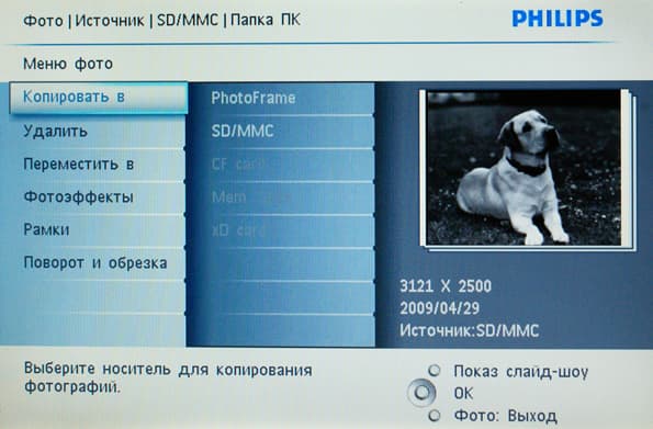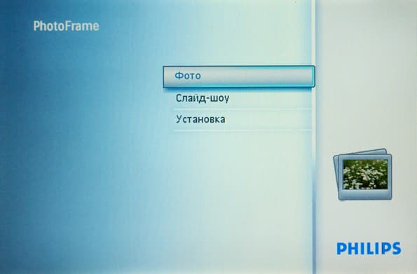 В главном меню имеются пункты Фото, Слайд-шоу и Установка.