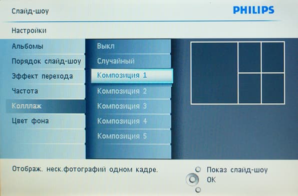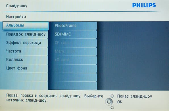 Находясь в каком-нибудь альбоме, можно запустить слайд-шоу. Для более гибкого управления этой функцией в главном меню и существует одноименный пункт. Рассмотрим его возможности.