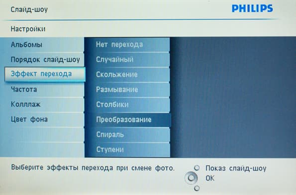 Далее можно настроить эффект перехода между фотографиями, коих имеется 15 штук, частоту смены кадров,настроить цвет фона, который отображается, если фотография не занимает всю площадь экрана.