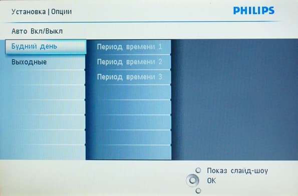 Имеется и возможность включать/выключать рамку в заданное время, причем опций несколько: в будний день можно настроить целых три периода, в течение которых рамка будет включаться/выключаться, в выходные один период.