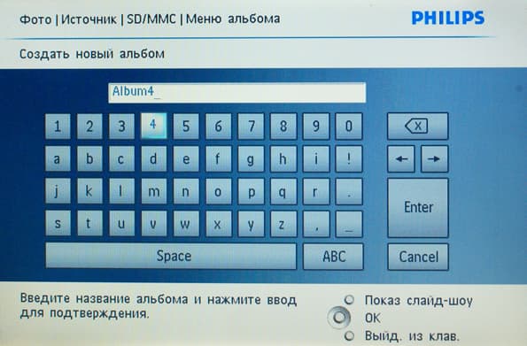При создании альбомов можно давать им названия, для этого имеется вируальная клавиатура. Раскладка на ней, к сожалению, не QWERTY, буквы идут просто по порядку, но функция вряд ли будет часто востребована.