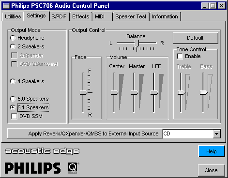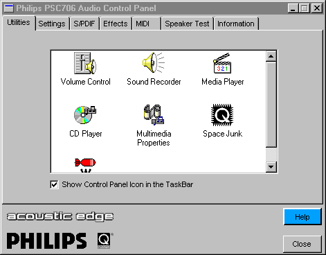 Для управления режимами работы карты служит утилита Philips PSC706 Audio Control Panel. В системном трее появляется значок, при нажатии на который и вызывается эта панель.