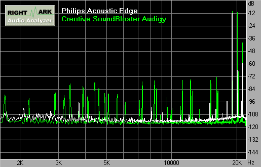 Отсутствие "леса гармоник" у Philips говорит прежде всего о более качественном алгоритме пересчёта из 44,1 кГц в 48 кГц. Но не стоит забывать, что такая ситуация возникает только на высоких частотах. Внизу картинка намного приятнее. Чтобы убедится в этом, достаточно посмотреть на графики THD для обеих карт.