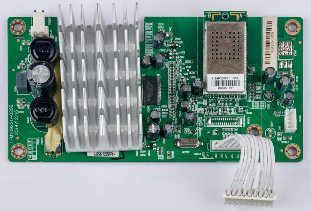 А сами платы точно такие же, как в сабвуфере саундбара, отличия лишь в незначительных деталях. Их две: на большей смонтирован импульсный блок питания, на меньшей усилитель с модулем беспроводной связи.