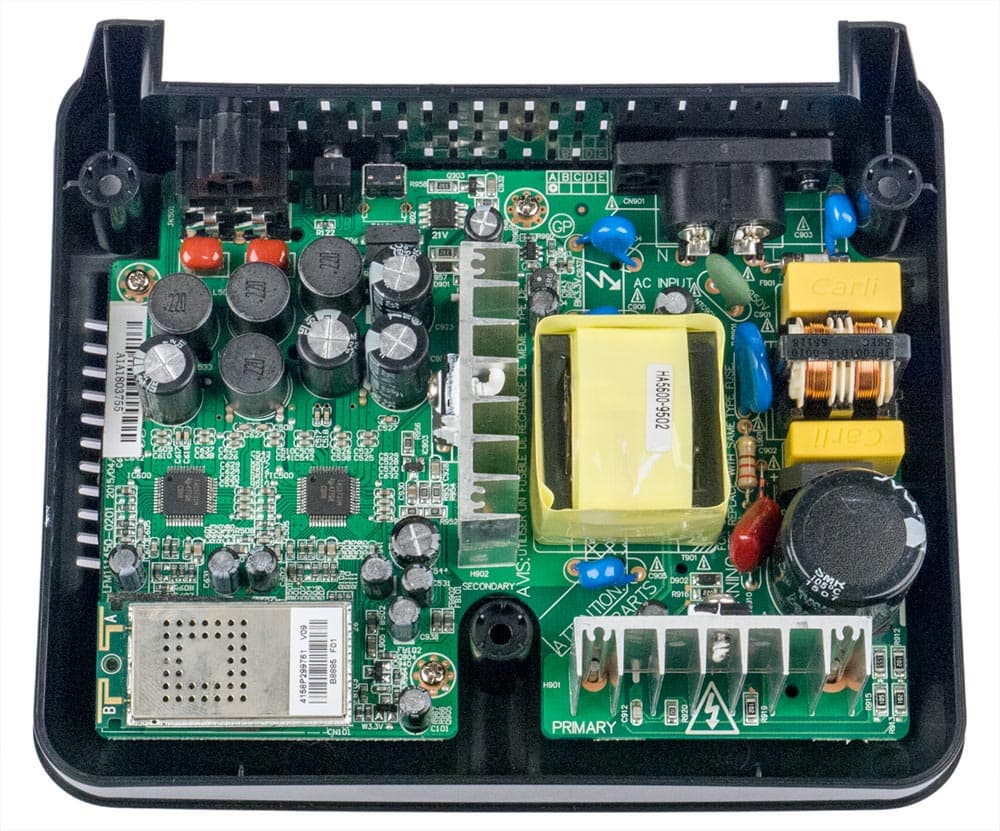 Соответственно внутри имеется источник питания, построенный по схеме с преобразованием частоты, и усилитель на двух микросхемах TAS5731, являющихся двухканальными УМЗЧ класса D. Каких-либо радиаторов у них нет, для отвода тепла используется печатная плата. Есть также небольшая платка с модулем Bluetooth.