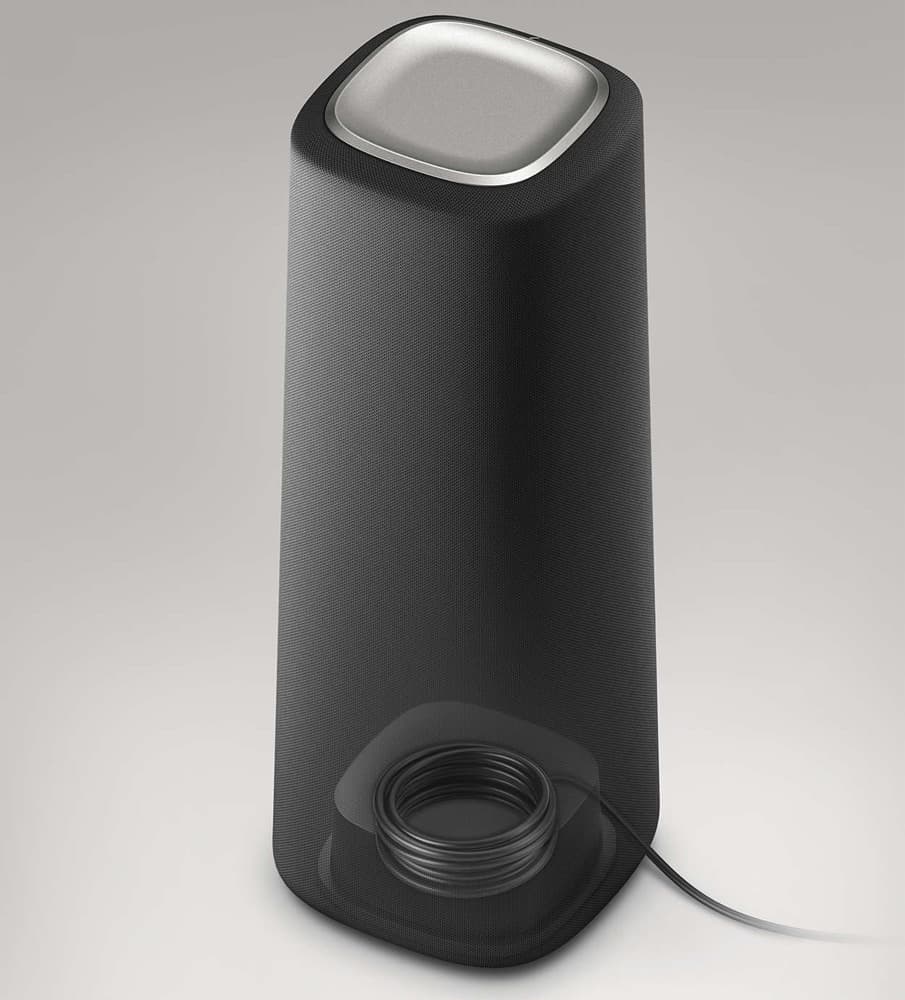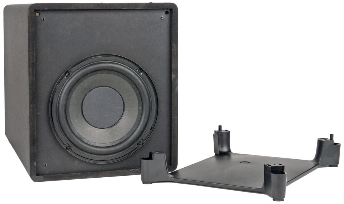 Акустически он оформлен как фазоинвертор, но имеет довольно необычное расположение динамика — на днище. Естественно, динамик «смотрит» не в пол, а в специальный пластиковый отражатель, имеющий купольную форму и позволяющий распределять звук на 360 °.