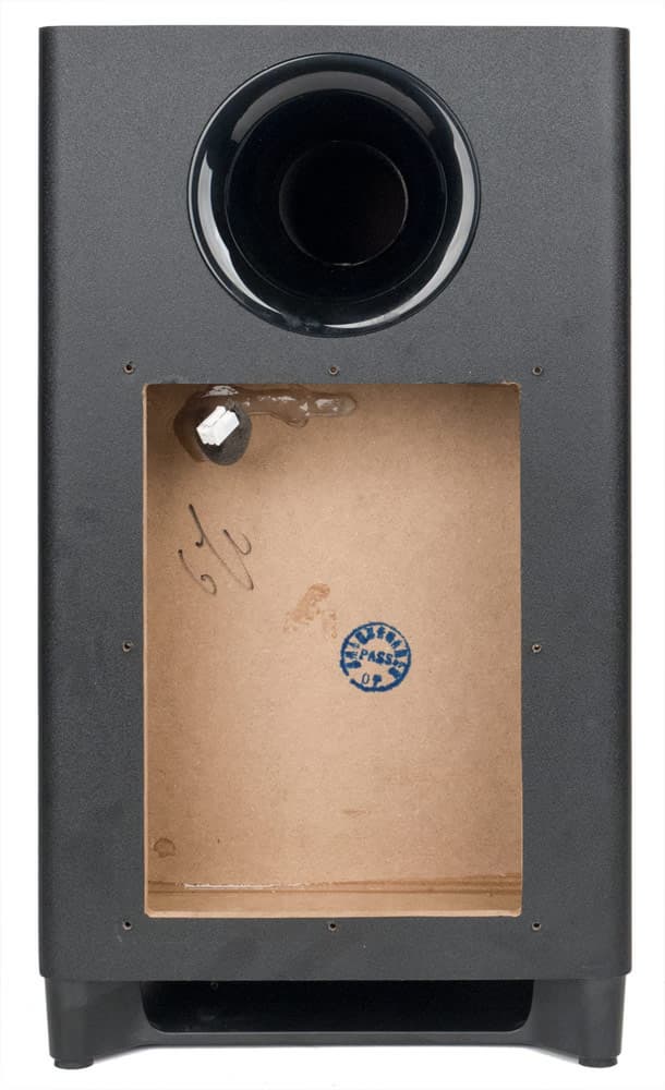 Для корпуса сабвуфера использован 9-миллиметровый MDF — по меньшей мере, наружные стенки имеют такую толщину, сделать замер для внутренних перегородок не представляется возможным.