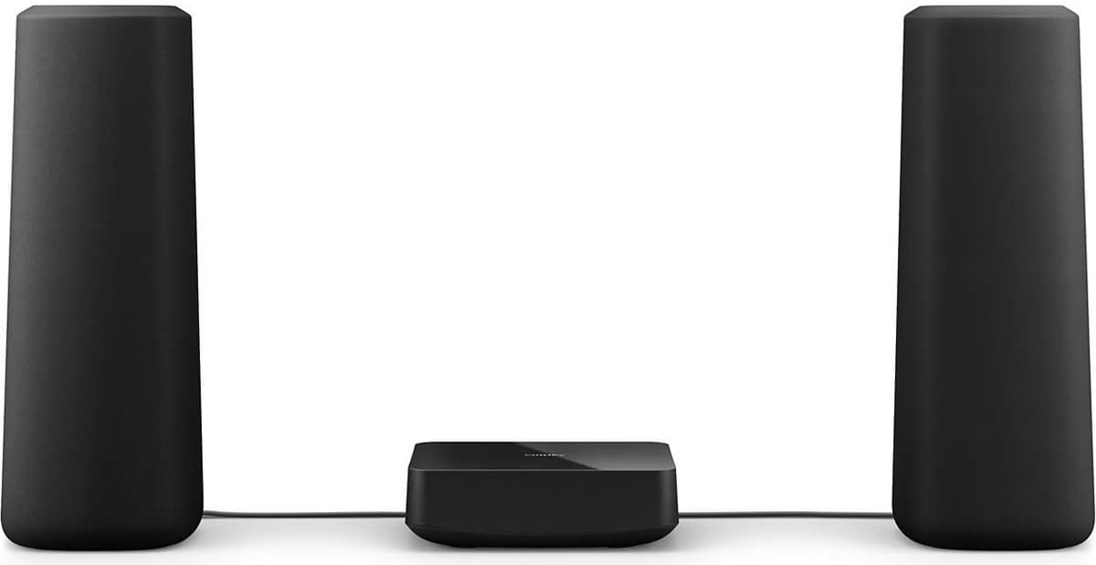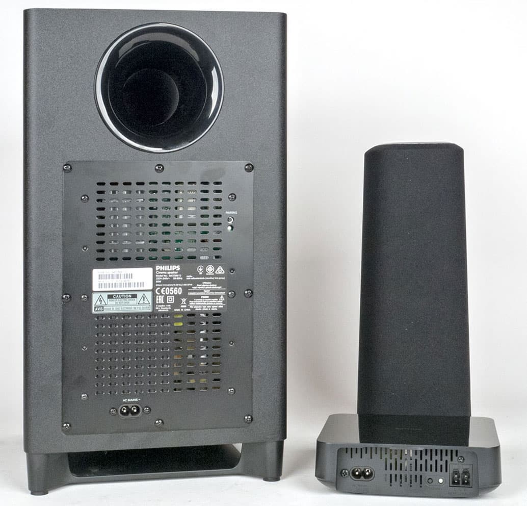 Упоминаемое в официальных описаниях беспроводное подключение тыловых АС в действительности является таковым лишь с большой долей условности: эта пара колонок всё равно подключается кабелями, просто тянуть провода надо не к центральному блоку, а к компактному ресиверу.