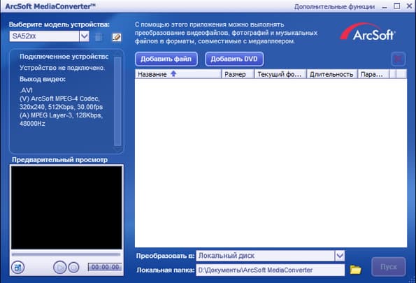 Возможностью проигрывать не перекодированное видео плеер нас не побалует. Для перекодирования из множества форматов (в том числе популярного в видеосервисах FLV) в поддерживаемый плеером имеется программа Media Converter for Philips. Ее настройки чрезвычайно просты, разобраться с ними может каждый — достаточно лишь выбрать из списка модель вашего плеера и нажать на кнопку «Пуск». Она конвертирует кодеком XVID, с битрейтом 512 кбит/с, в разрешение 320*240, с частотой 30 кадров в секунду. Звук кодируется в MP3 с частотой 48 кГц и битрейтом 128 кбит/с.