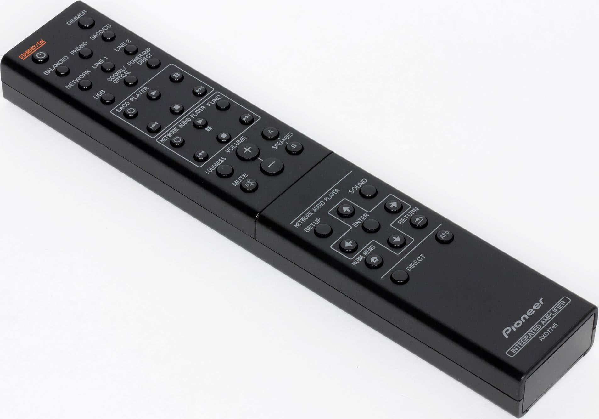 Пульт, на первый взгляд, похож на пульт модели А-50, только добавлены цифровые кнопки. При использовании усилителя очень скоро нашлось приятное отличие, которого очень на хватало раньше: прямой вход можно включить не только на передней панели усилителя кнопкой Power Amp Direct, но и одноименной кнопкой на пульте. Теперь после просмотра фильма, где усилитель работал в составе ДК, получая сигнал с преаутов ресивера, можно перейти к прослушиванию музыки, просто нажав кнопку нужного входа на пульте. И наоборот: можно, не вставая с дивана, включить прямой вход на усилителе. Аппарат не подвержен сильному нагреву, так что он работал в просторной, но закрытой стеклянной дверцей стойке, и переключение на предыдущей модели было связано с лишними телодвижениями. Помимо регулировки громкости, кнопок выбора входов и управления воспроизведением для совместимых компонентов, на пульте имеются кнопки автоматического перехода в режим ожидания при отсутствии сигнала в течение получаса (APD) и регулировка яркости индикаторов (Dimmer), а также кнопка Direct.