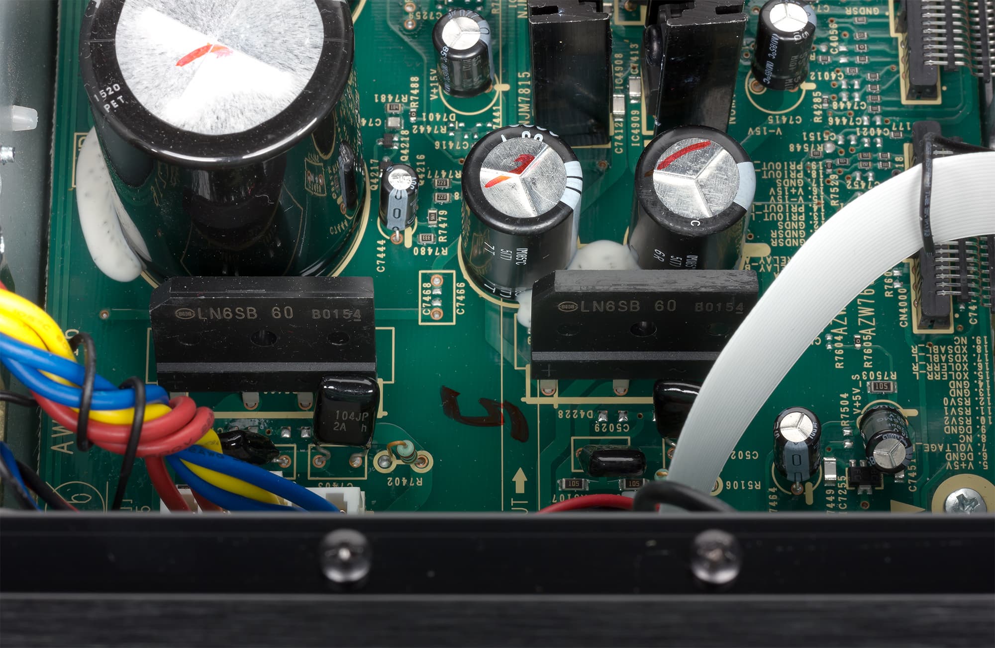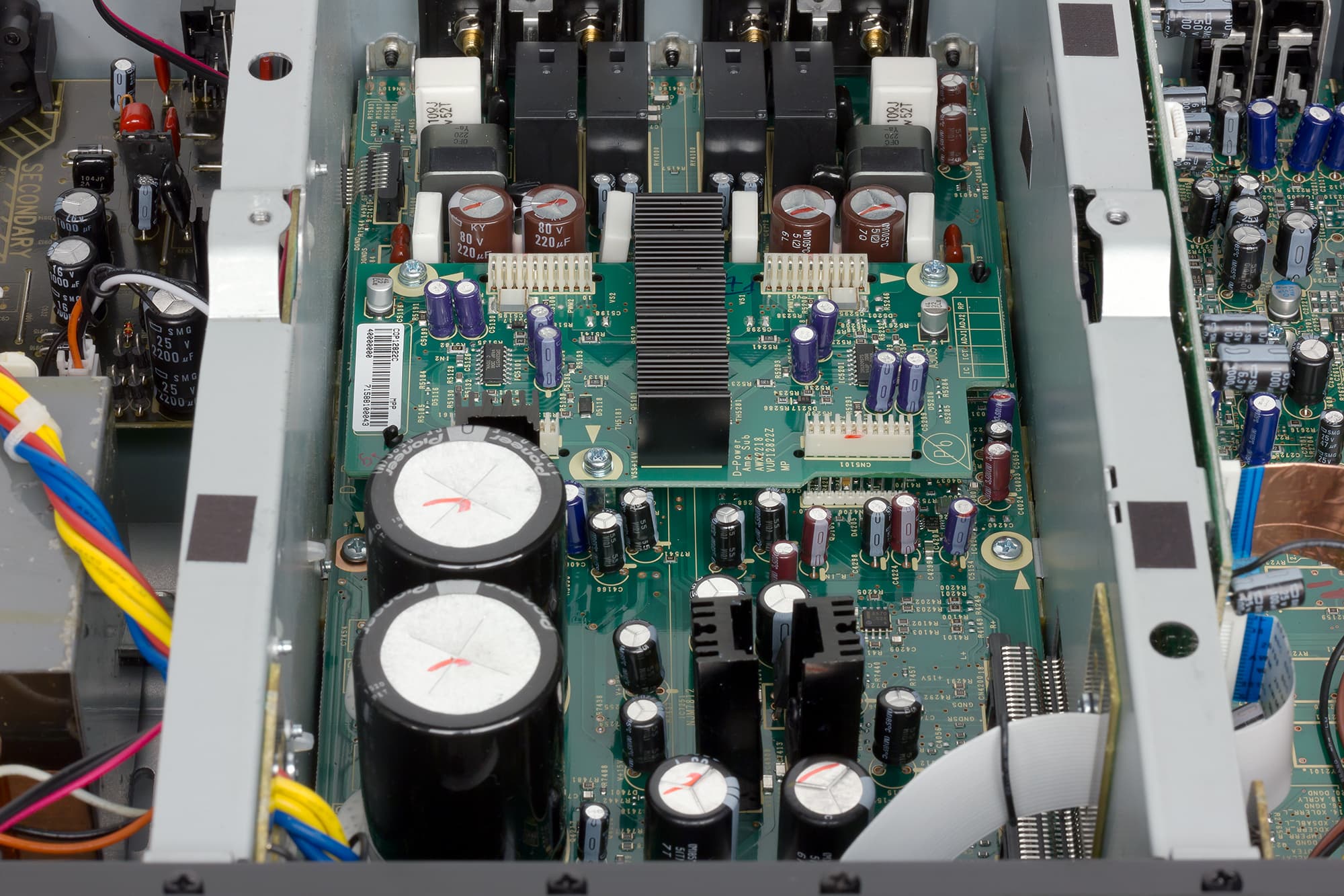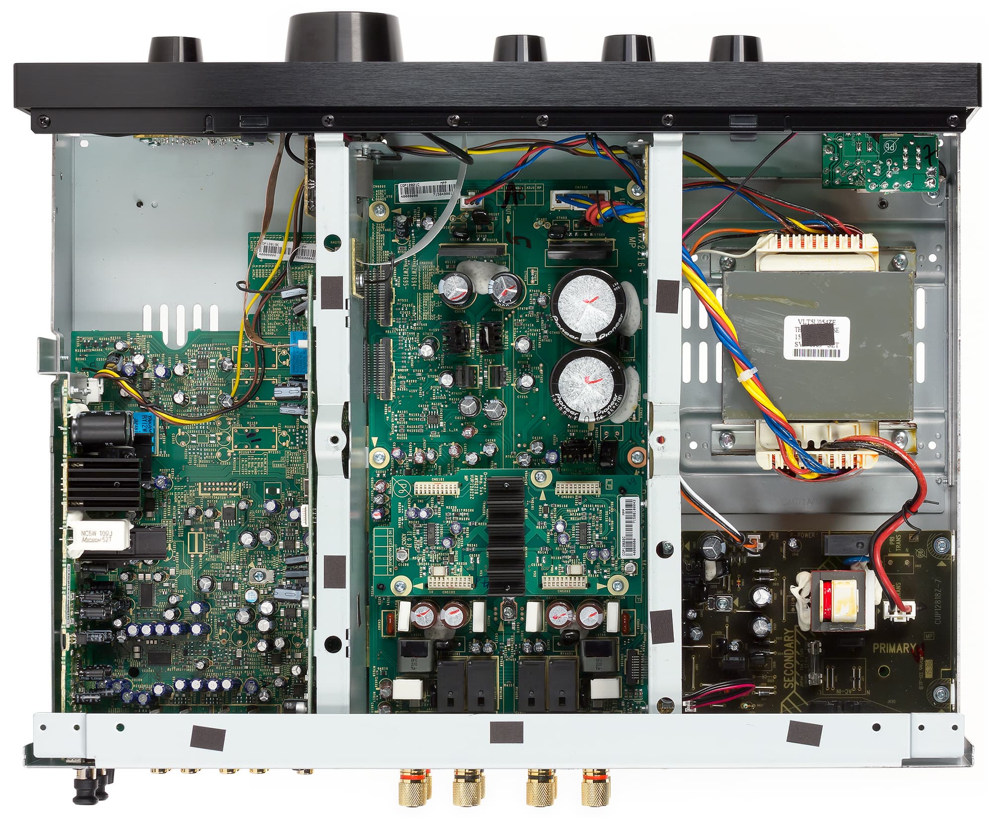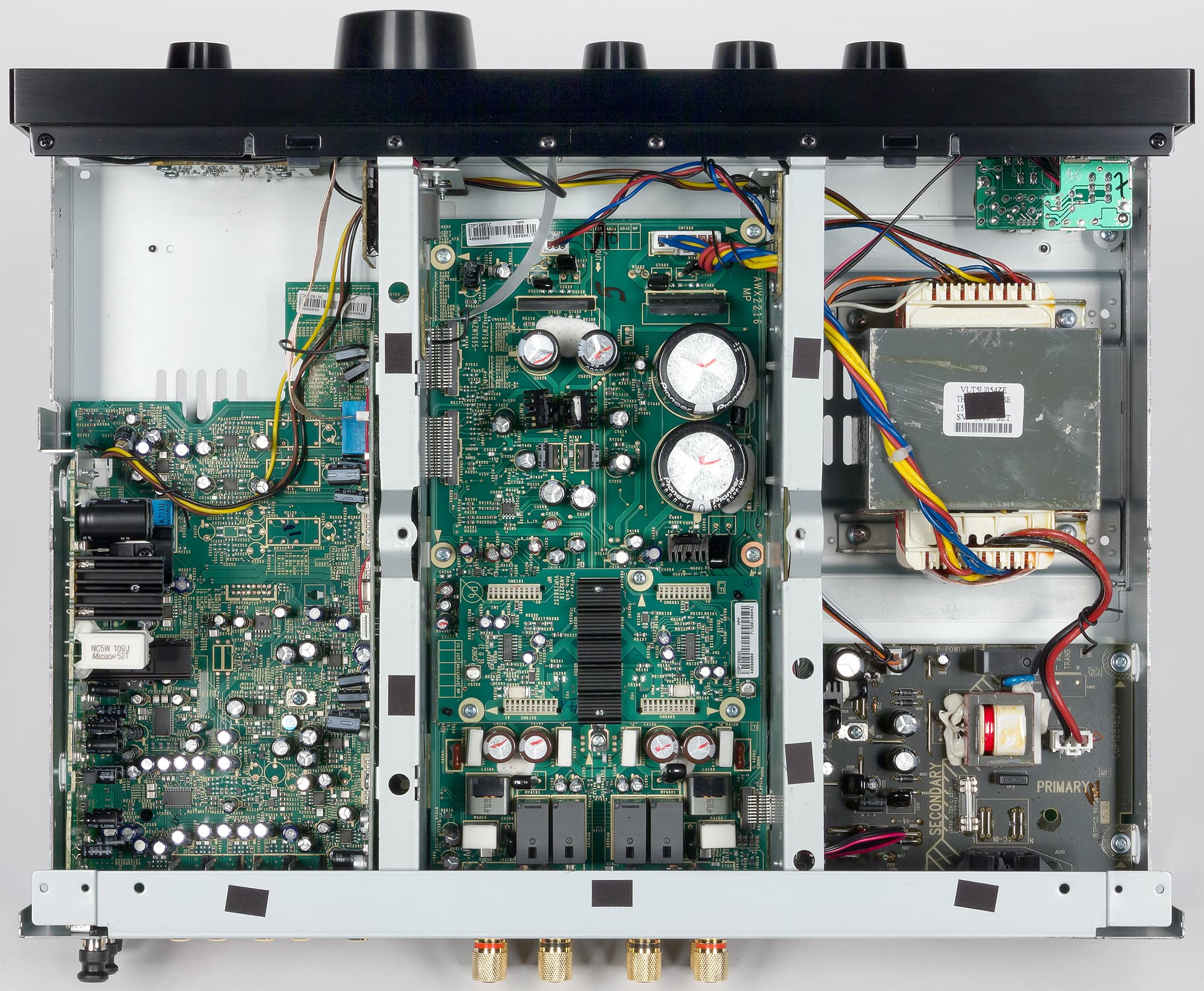 Видно, что даже в усилителе классе D компания Pioneer использует линейный источник питания с трансформатором на Ш-образном сердечнике. С целью снижения перекрестных помех секции предварительного усилителя, усилителя мощности и контрольных схем питаются от отдельных изолированных обмоток силового трансформатора, а ЦАП, предварительный и оконечные усилители собраны на разных платах, размещенных в разных отсеках шасси. Отсеки образуются перегородками, которые, в свою очередь увеличивают жесткость корпуса.