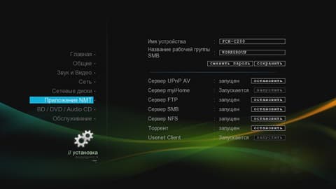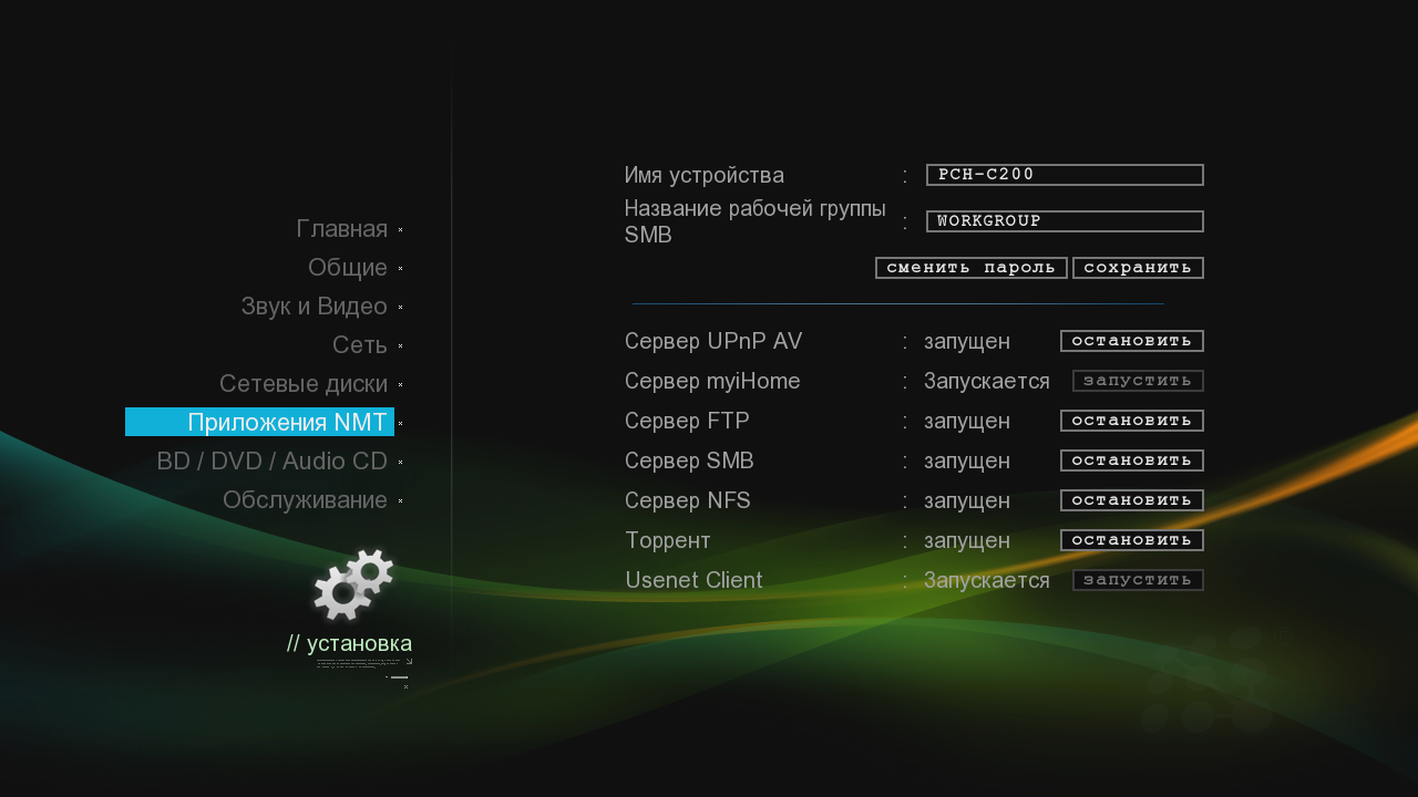 В результате после перезагрузки пользователь получает доступ к меню «Приложения NMT», в котором уже происходит непосредственное управление программами. В рассматриваемой версии прошивки их список следующий: сервер UPnP AV, сервер myiHome, сервер FTP, сервер SMB, сервер NFS, торрент, клиент Usenet (NZB). Каждый сервис можно независимо включать/выключать через меню плеера в любой момент.