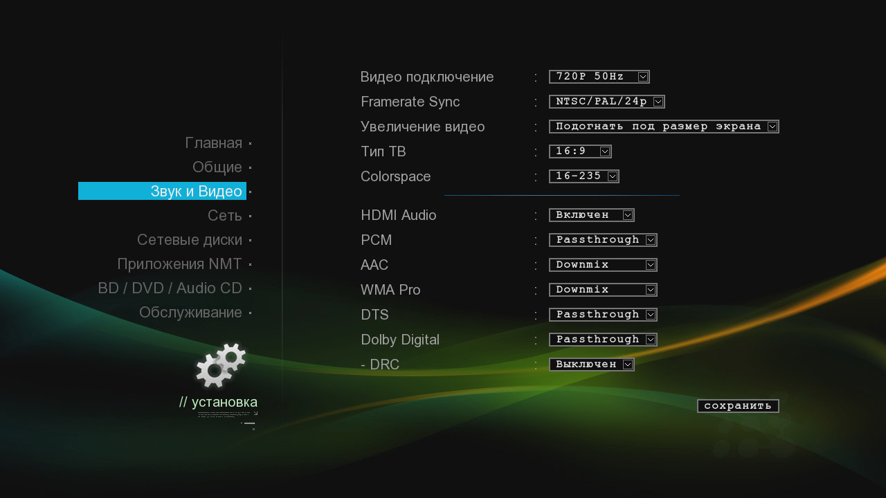 По звуку опций немного меньше и они касаются в основном подбора под параметры ресивера — для каждого из форматов PCM, AAC, WMA Pro, DTS, DD можно выбрать или декодирование и вывод в стерео или же прямую передачу потока на ресивер. Напомним, что многоканального аналогового выхода у устройства нет, так что или у вас только стерео или нужен ресивер.