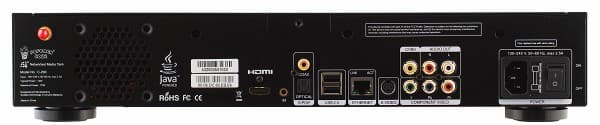 Также сзади находятся все разъемы: коннектор для антенны, HDMI, вход для опционального ИК-датчика пульта ДУ, оптический и коаксиальный цифровые аудиовыходы, два порта USB, сетевой порт RJ45, выход S-Video, композитный и компонентный видео выходы, стерео аудио выход, вход для кабеля питания и выключатель.