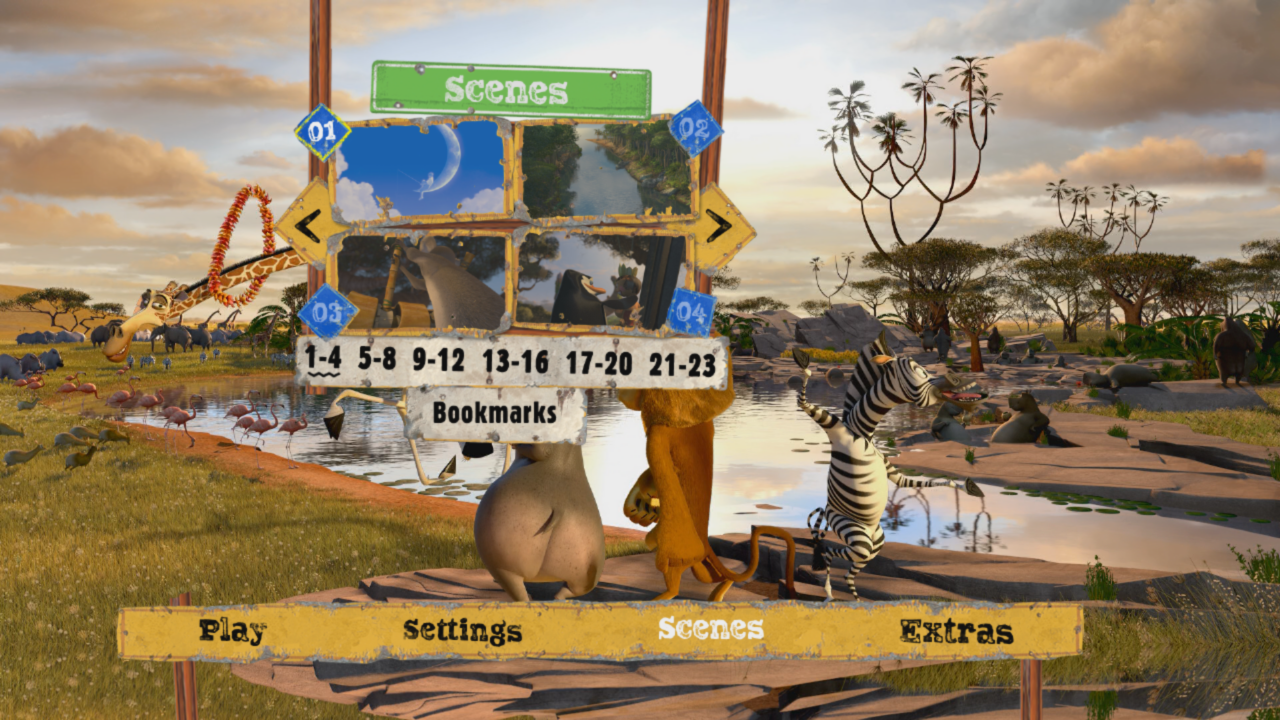 Главное меню плеера имеет оформление в виде шести иконок, за каждой из которых может скрываться дополнительный список пунктов. Четыре из них относятся к основным носителям — оптический диск, жесткий диск, USB-накопители и сеть. Пятая — переход к настройкам, а шестая — к Интернет-сервисам.