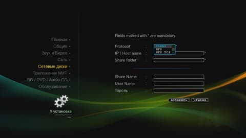 Для упрощения доступа к сетевым дискам предусмотрена возможность заранее запрограммировать необходимые ссылки через соответствующее меню. После этого они будут отображаться под иконкой сети в главном меню. Для каждой указывается пользовательское название, протокол (SMB, NFS UDP или NFS TCP), адрес сервера, имя общего ресурса, имя пользователя и пароль (для SMB). Порядок отображения в списке совпадает с порядком их программирования. К сожалению, возможности его простого изменения нет.