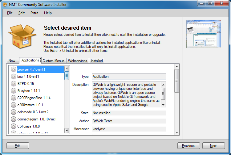 Если же и этого функционала недостаточно, то можно относительно легко перейти на новый уровень — установив систему управления пакетами CSI, разработанную энтузиастами. Для этого достаточно только скачать из Интернет установочный файл и запустить его. После выбора устройства и нужного пакета из он-лайнового репозитория производится установка. Кроме этого набора есть и отдельные утилиты, например для управления плеером с компьютера через браузер. При желании пользователь может получить доступ к консоли плеера и самостоятельно управлять его работой. Для более подробного изучения нестандартных возможностей рекомендуем посетить сайт NMTWiKi.