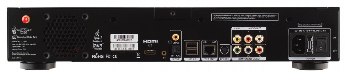 Для подключений к аудио-видео техники и локальной сети в C-200 есть достаточно много вариантов. В частности для видео можно использовать композитный, S-Video, компонентный или HDMI выходы. Последний имеет версию 1.3a, что может означать поддержку HD-форматов звука. Кроме HDMI предусмотрены аналоговый стерео и цифровые оптический и коаксиальный звуковые выходы.
