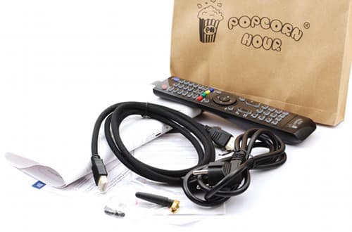 В коробке кроме плеера можно обнаружить бумажный пакет, продолжающий «зеленую» тему в упаковке, в котором находятся необходимые аксессуары: пульт дистанционного управления с батарейками (2×AAA), кабель питания, кабель HDMI, антенна, комплект болтов, краткая печатная инструкция и пара листовок.