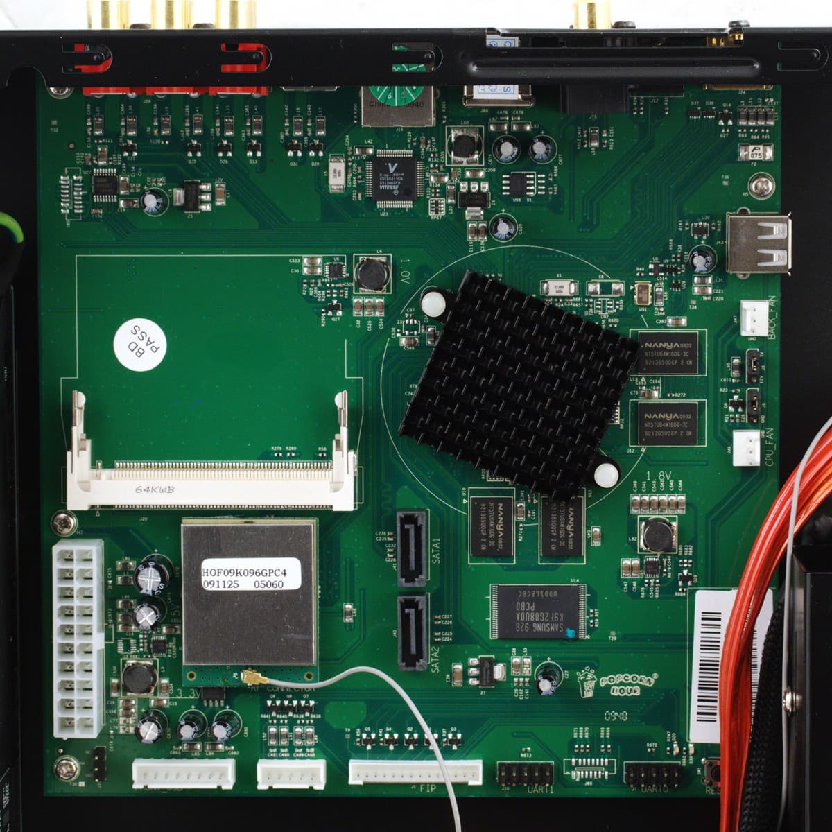 На ней расположен основной медиапроцессор SMP8643, закрытый радиатором, четыре чипа оперативной памяти с общим объемом 512 МБ и 256 МБ флешчип. Обращает на себя внимание также радиомодуль для пульта ДУ и разъем MII, который может использоваться с опциональным беспроводным модулем стандарта 802.11n. Есть внутри и стандартный разъем USB, его удобно использовать для создания системного диска.