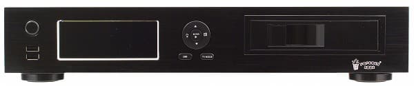На передней панели с левой стороны находится выключатель питания со встроенным индикатором, два порта USB и жидкокристаллический экран с голубой подсветкой. В центре поместили несколько кнопок управления, а правая часть занята отсеком для установки жесткого диска или оптического привода. По бокам находятся вентиляционные решетки устройства. При необходимости пользователь может самостоятельно установить на заднюю панель вентилятор 60 мм. Крепление для него есть в комплекте, а на печатной плате — стандартный трехконтактный разъем питания. Возможно, это может потребоваться в случае инсталляции в плеер жесткого диска, но в нашем тестировании мы это не использовали.