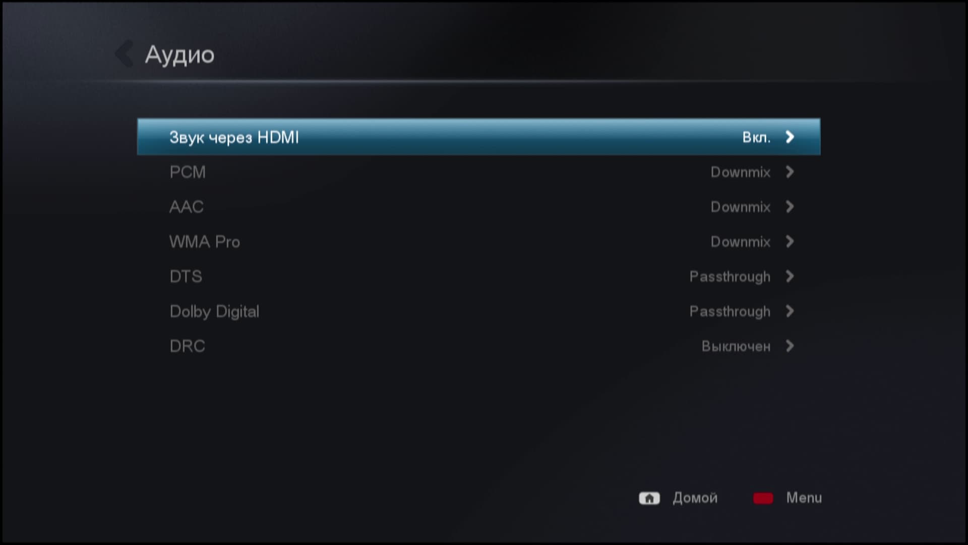 В отличие от передачи звука по HDMI, вывод через другие интерфейсы (оптический и коаксиальный) не огорчил. Всё работает так, как и положено: сжатые форматы отсылаются на ресивер без изменения, а DTS HD трансформируется в DTS и корректно передаётся на ресивер.