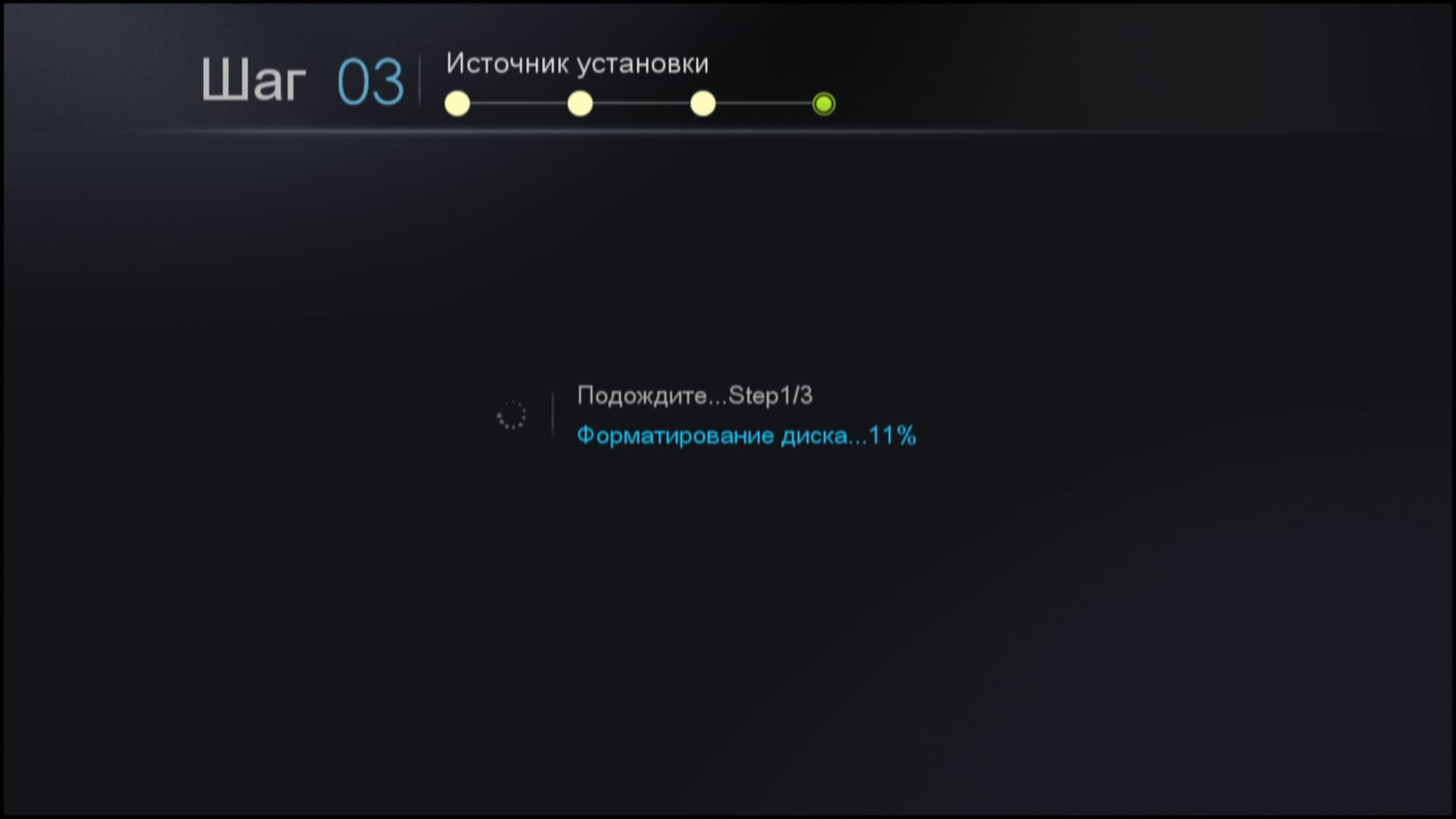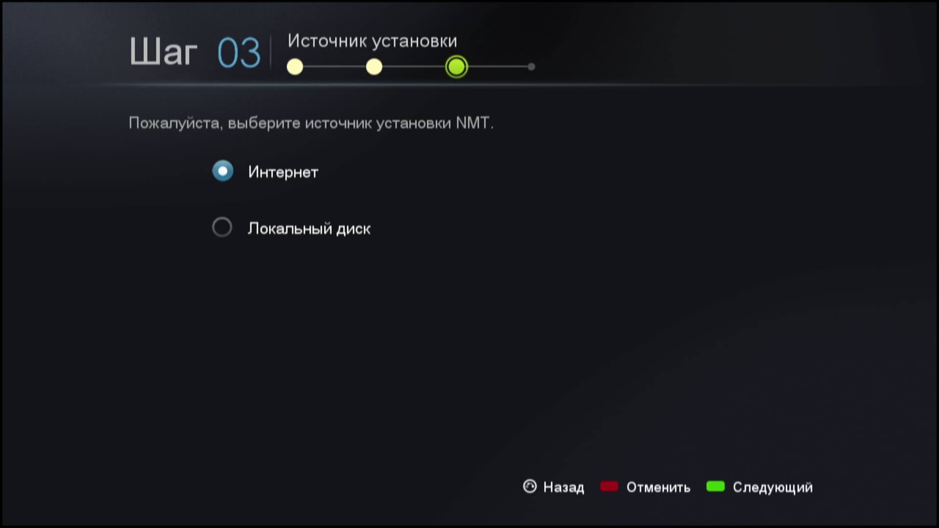 | Выбор места хранения медиа | Выбор источника установки | Форматирование диска, установка NMT |