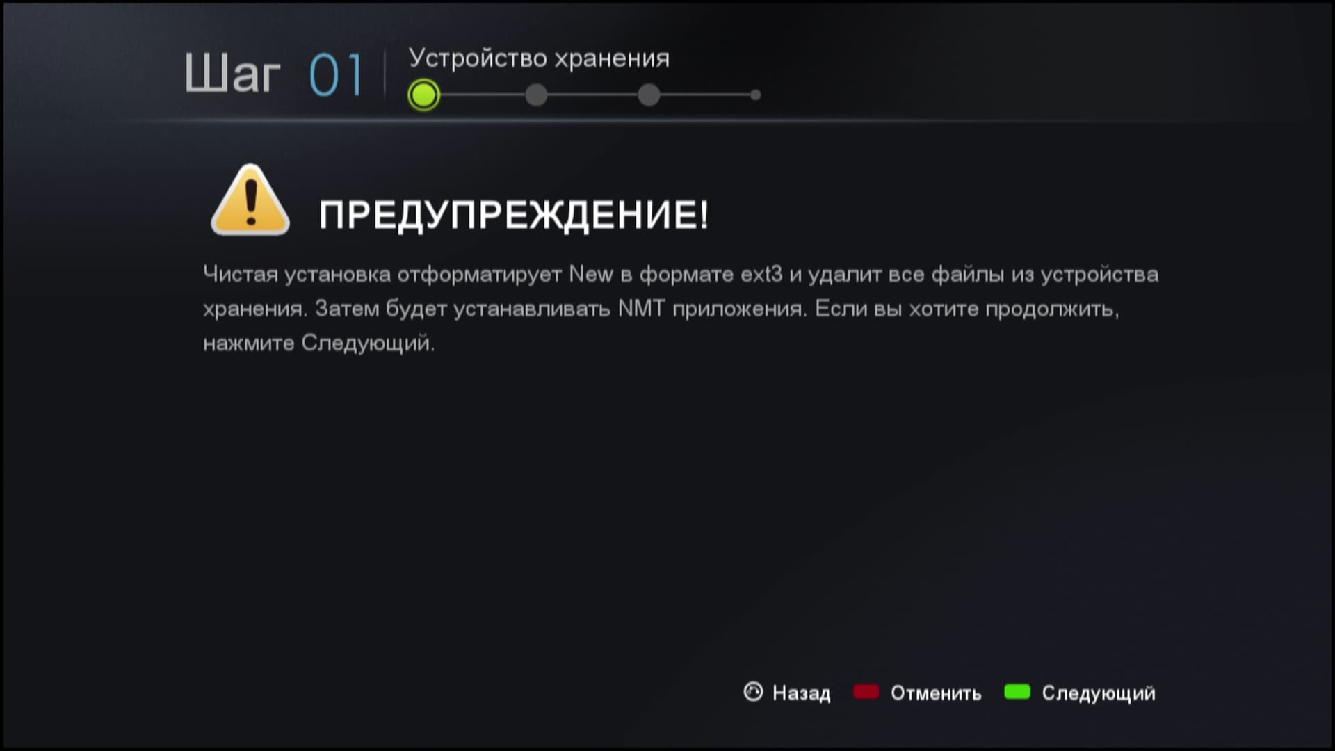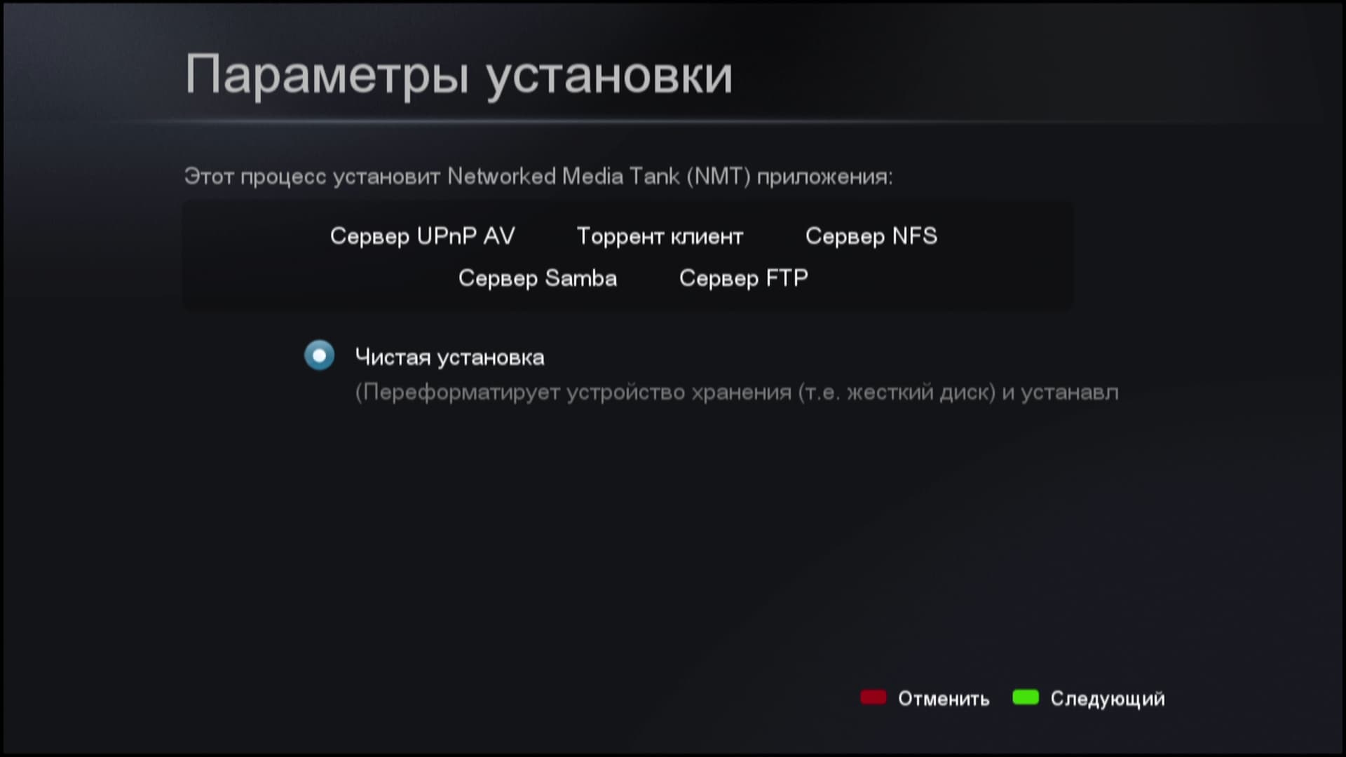 Процесс установки NMT несложен — знай нажимай зелёную кнопку на пульте ДУ. Внимание: в процессе установки все данные на жёстком диске будут уничтожены, а файловая система диска изменится на ext3, которая применяется в операционных системах на ядре Linux.