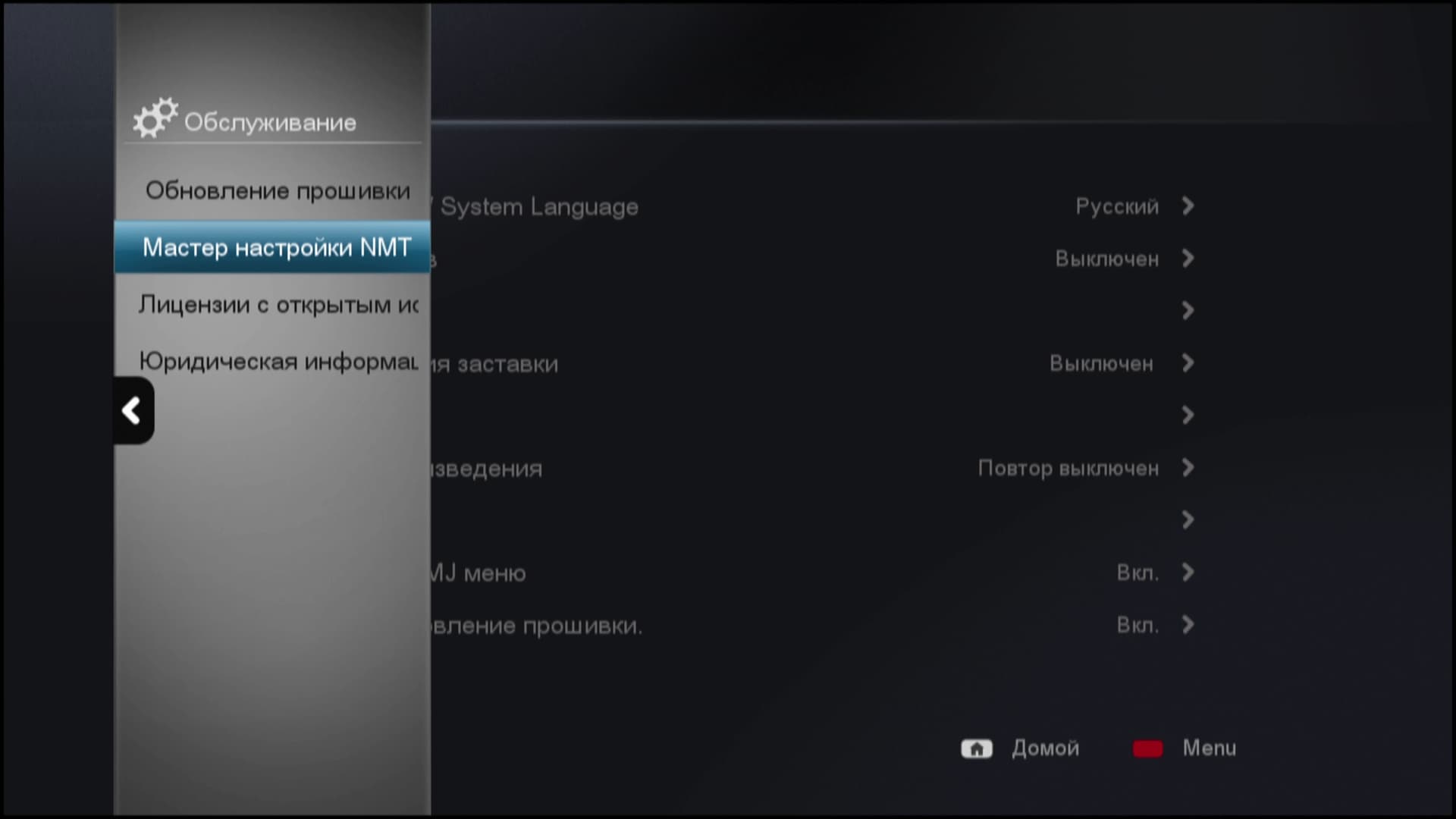 Прежде, чем приступить к изучению программной составляющей устройства, следует знать: для полноценной работы плееру требуется накопитель. В идеале — внутренний жёсткий диск. Ведь лоток HDD в плеере не для красоты же. Но, оказывается, вовсе недостаточно просто вставить диск в плеер. Накопитель нужно ещё и подготовить. К счастью, делается это непосредственно силами плеера. В настройках аппарата следует найти пункт Обслуживание, из которого запустить Мастер настройки NMT. Эта аббревиатура расшифровывается как Networked Media Tank и представляет собой программную платформу для медиаплееров, разработанную компанией Syabas. Данная платформа содержит необходимые сетевые приложения, и лишь после установки NMT плеер сможет выполнять все заявленные функции.