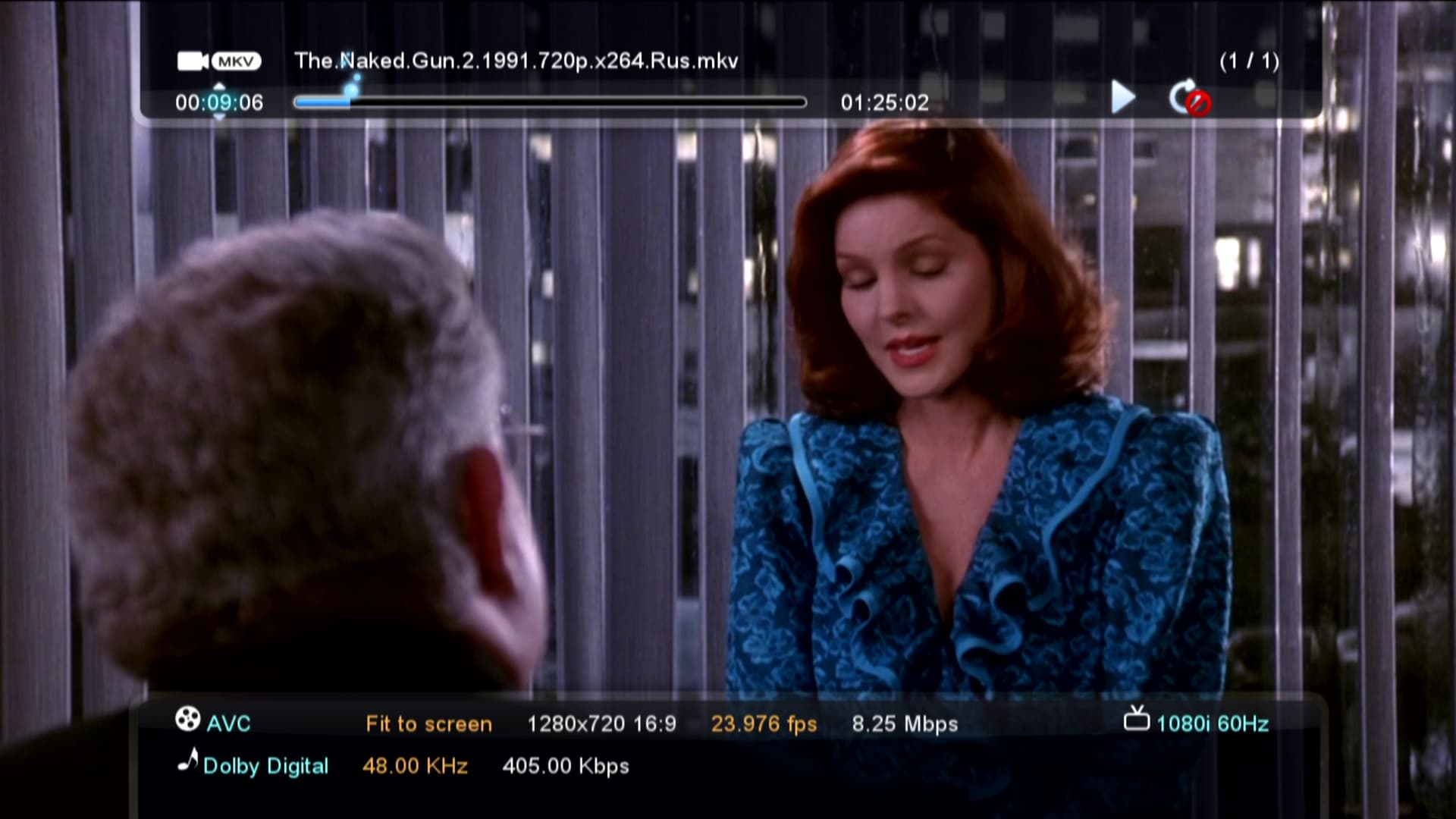 При воспроизведении плеер даёт возможность просмотра информации о файле, быстрого перехода по фильму с помощью ручного ввода нужного значения либо просто передвижением ползунка. Такой же быстрый, но не совсем точный переход осуществляется нажатием цифровых кнопок пульта ДУ, где цифра 1 соответствует 10% фильма, 2 = 20% и так далее.