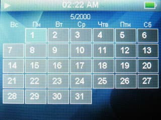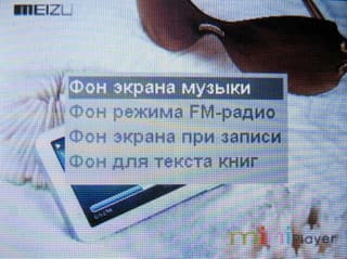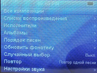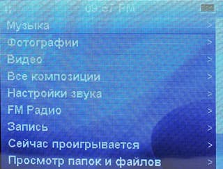 Меню организовано по категориям. Перечислю все: Музыка, Видео, Фотографии, Все композиции, Настройки звука, Радио, Запись, Сейчас проигрывается, Просмотр папок и файлов, Игры, Калькулятор, Календарь, Таймер подсветки. При желании, различные пункты можно добавить или удалить из главного меню при помощи настроек как в Apple iPod или Creative Zen.