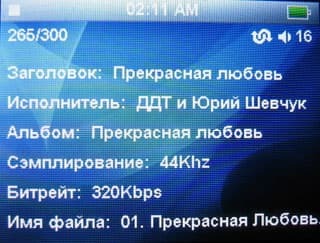 Отличительной особенностью данной модели является поддержка относительно большого числа аудиоформатов WMA, MP3, OGG и несжатые WAV PCM. Со всеми тестовыми файлами плеер справился без проблем. Информацию тега файла можно просмотреть.